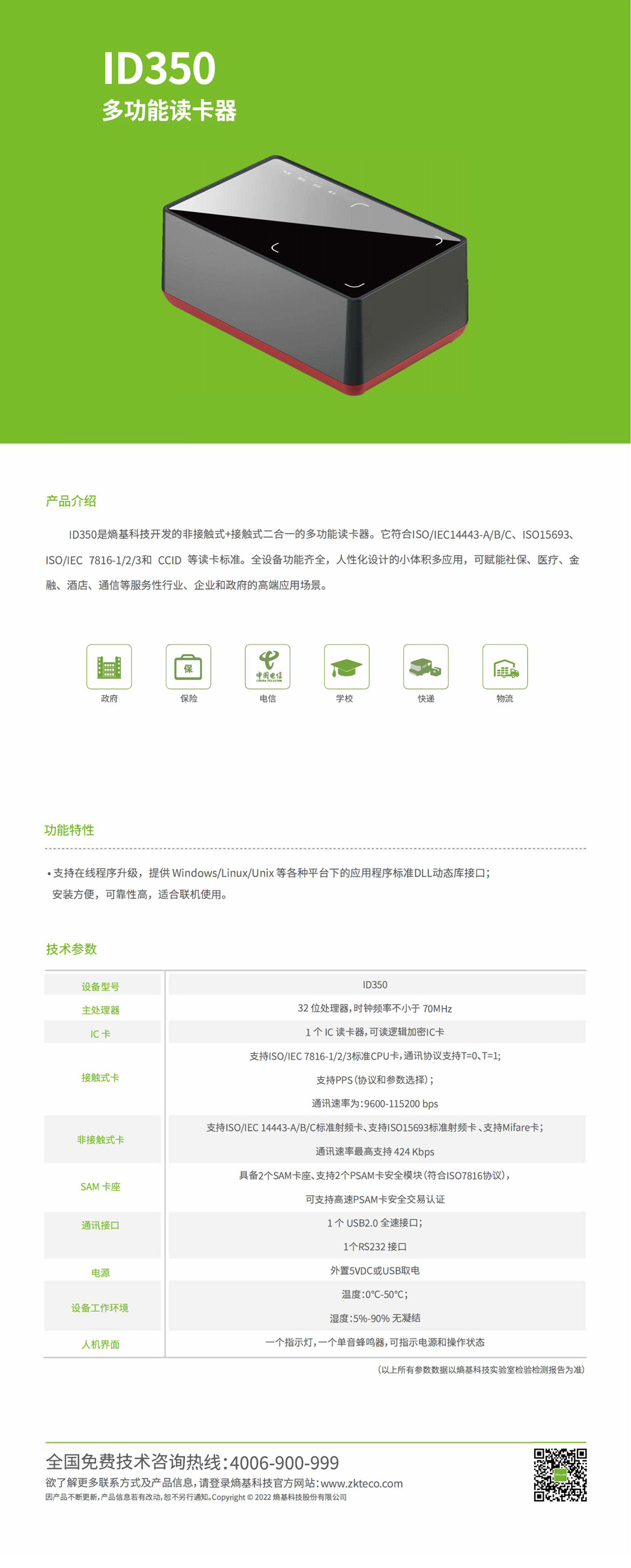 ID350是熵基科技开发的非接触式+接触式二合一的多功能读卡器。它符合ISO/IEC14443-A/B/C、ISO15693、ISO/IEC 7816-1/2/3和CCID等读卡标准。全设备功能齐全,人性化设计的小体积多应用,可赋能社保、医疗、金融、酒店、通信等服务性行业、企业和政府的高端应用场景。